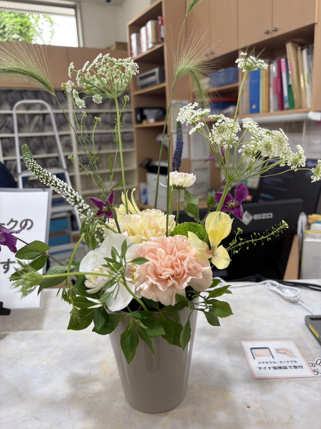 春風に揺れる花たちのアレンジです