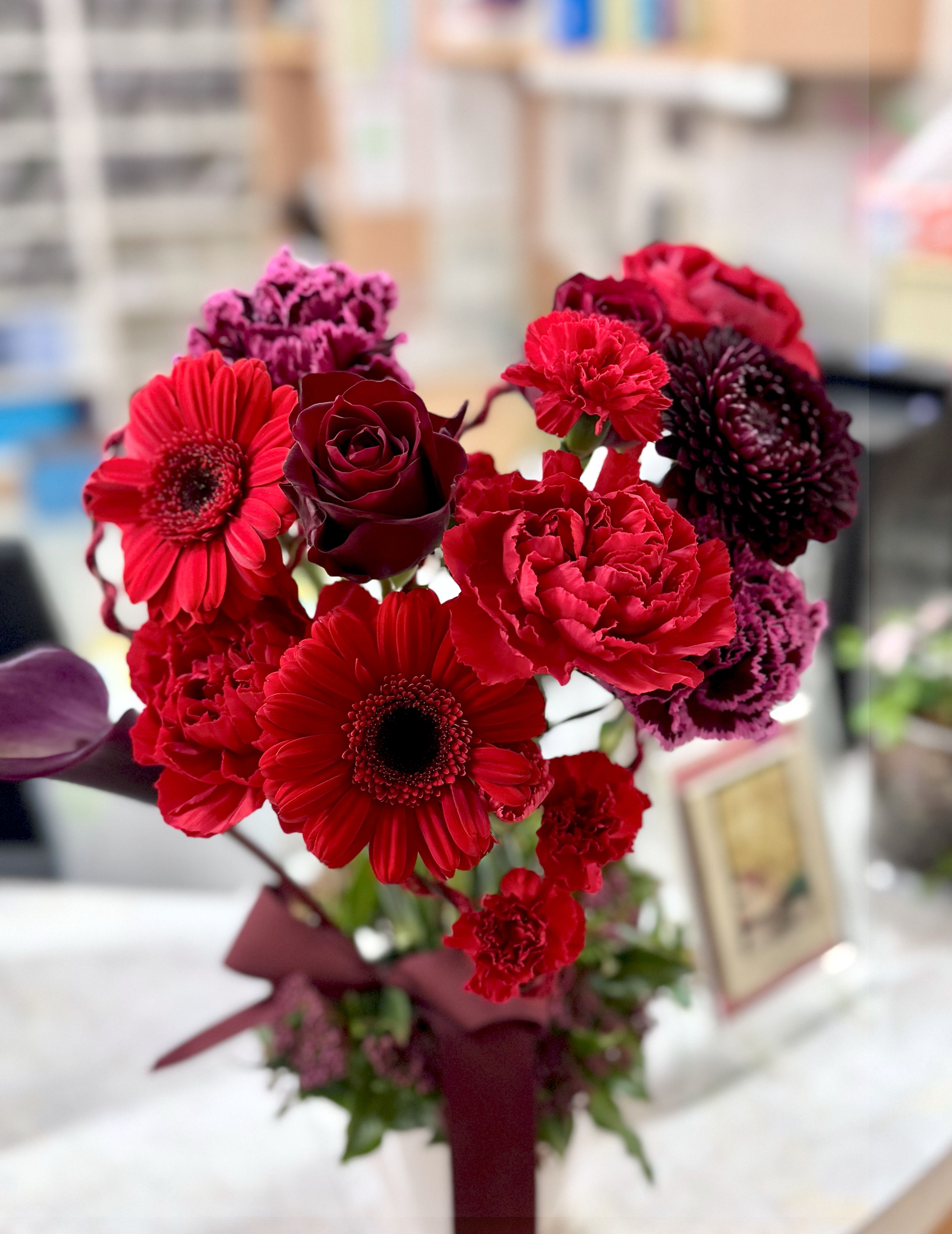 バレンタインにちなんだ、赤い花のハートのアレンジです
