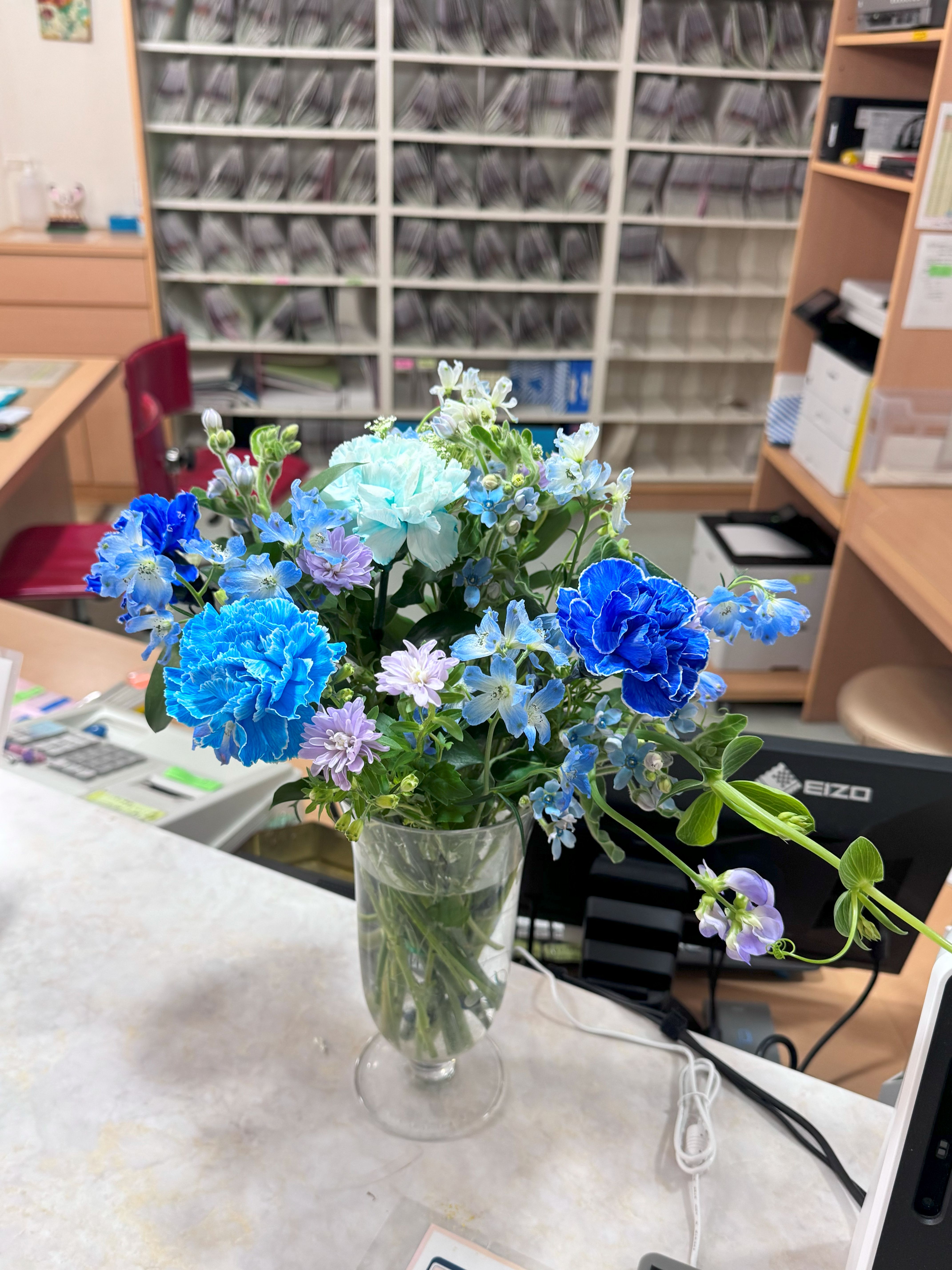 青いカーネーションをメインにブルーの花でまとめました